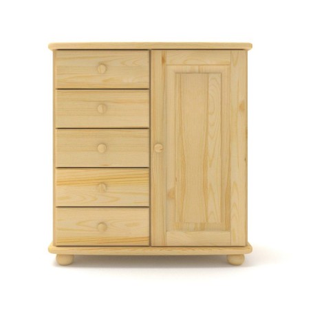 Klasyczna drewniana komoda sosnowa z pięcioma szufladami i drzwiami z półką, wykonana z litego drewna sosnowego.