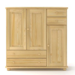 Klasyczna duża bieliźniarka sosnowa z trzema drzwiami i małymi oraz dużymi szufladami, wykonana z litego drewna sosnowego.