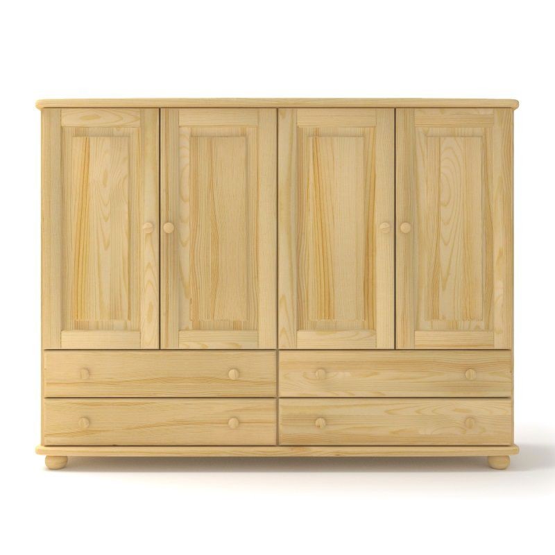 Klasyczna duża i pojemna bieliźniarka sosnowa z czterema podwójnymi szufladami w dolnej części oraz drzwiami wykonana z litego drewna sosnowego.