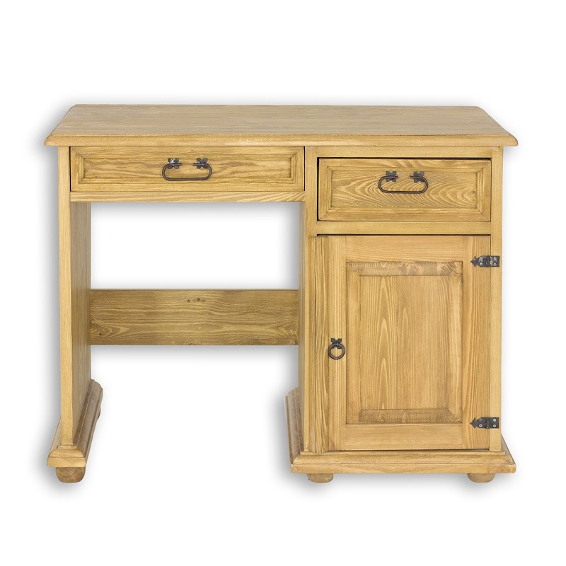 Klasyczne rustykalne drewniane biurko sosnowe woskowane z dwiema szufladami i drzwiczkami.