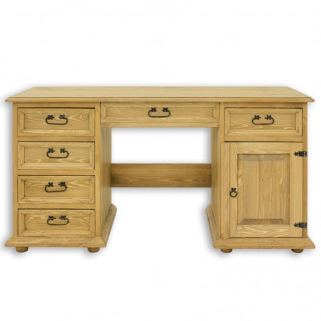 Klasyczne duże rustykalne drewniane biurko sosnowe woskowane z sześcioma szufladami i drzwiczkami.