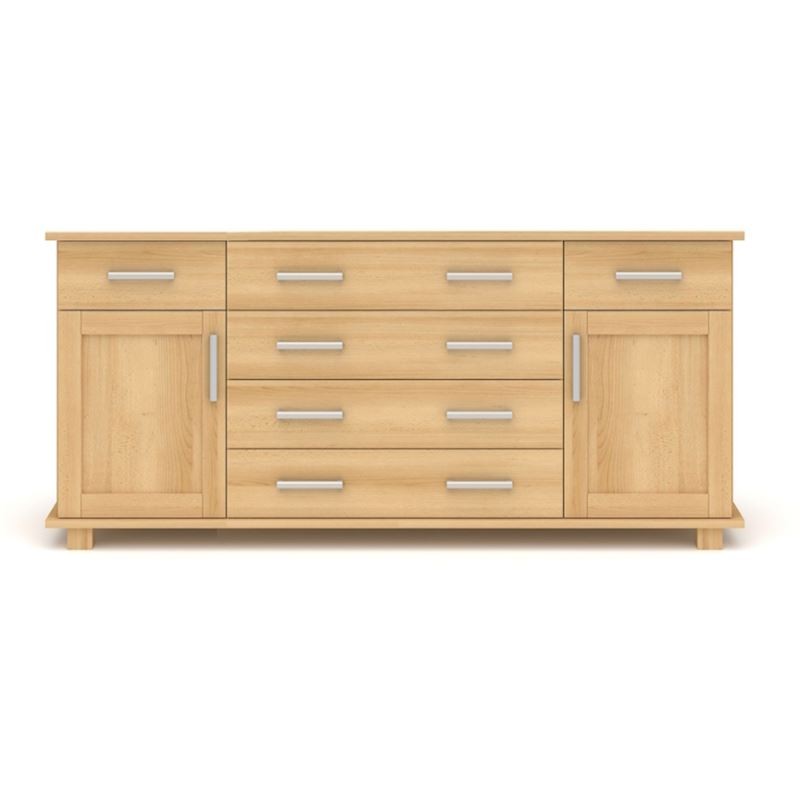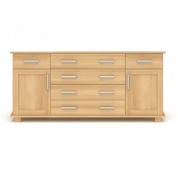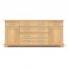 Szeroka komoda bukowa z drzwiami po obu stronach oraz szufladami w środkowej części + nad drzwiczkami, wykonana z litego drewna bukowego.