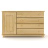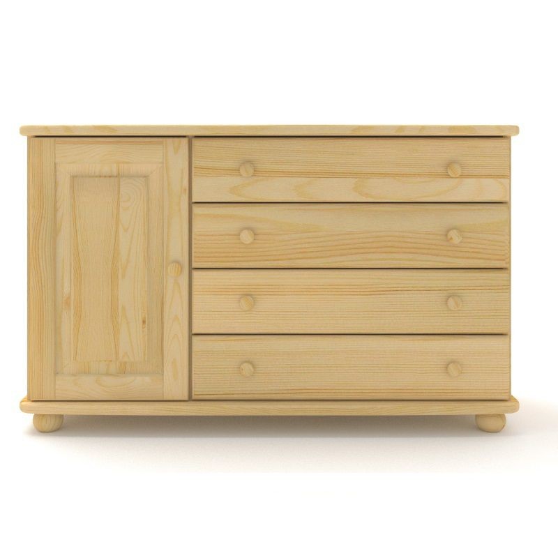 Klasyczna drewniana komoda sosnowa z czterema pojemnymi dużymi szufladami po prawej stronie i drzwiami z półką, wykonana z litego drewna sosnowego.