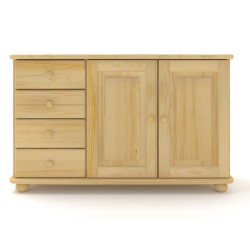 Klasyczna drewniana komoda sosnowa z czterema szufladami po lewej stronie i podwójnymi drzwiami z dużą półką, wykonana z litego drewna sosnowego.