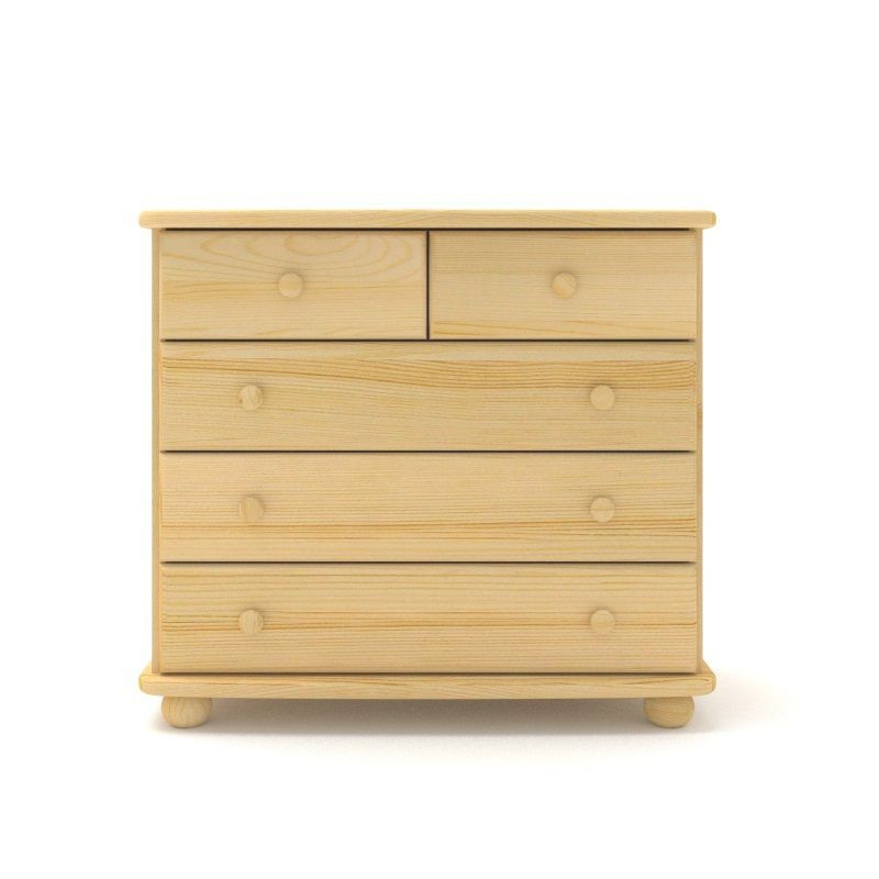 Klasyczna drewniana komoda sosnowa z trzema dużymi i dwiema mniejszymi szufladami, wykonana z litego drewna sosnowego.