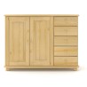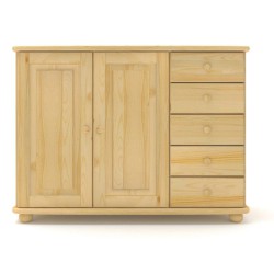 Klasyczna komoda sosnowa z pięcioma szufladami po prawej stronie i i parą drzwi z półką, wykonana z litego drewna sosnowego.