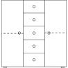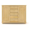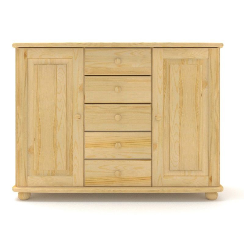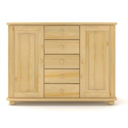Klasyczna komoda sosnowa z pięcioma szufladami i drzwiczkami z półką po obu stronach, wykonana z litego drewna sosnowego.