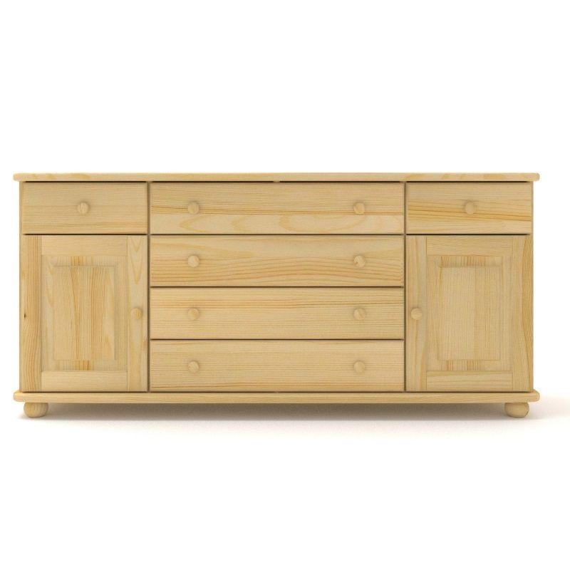 Klasyczna komoda sosnowa z czterema dużymi szerokimi szufladami i pojedynczymi drzwiami po obu stronach z jedną półką i szufladą, wykonana z litego drewna sosnowego.