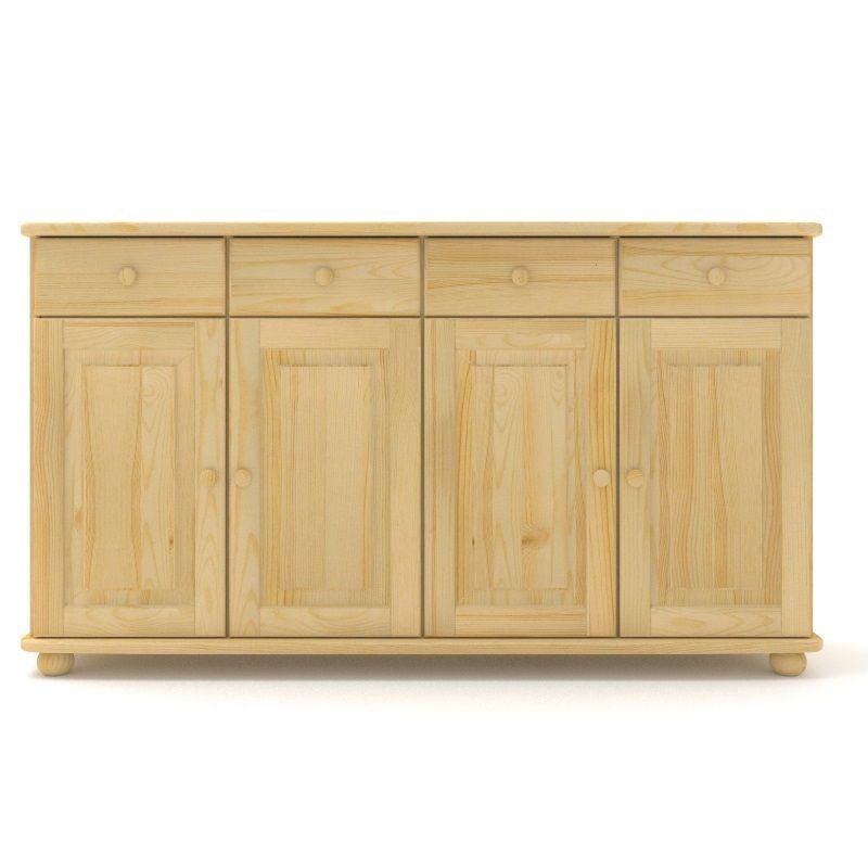 Klasyczna komoda sosnowa, wyposażona w dwie pary podwójnych drzwi z półką oraz szufladami nad nimi, wykonana z litego drewna sosnowego.