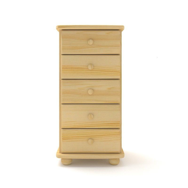 Klasyczna wąska pojedyncza komoda sosnowa typu słupek z pięcioma szufladami, wykonana z litego drewna sosnowego.