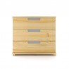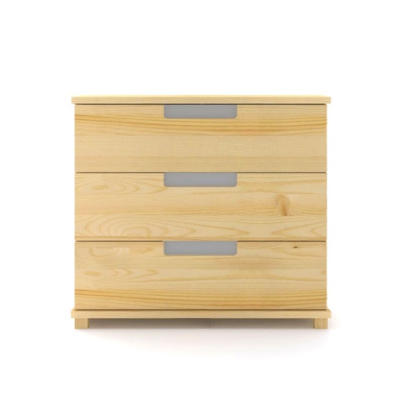 Nowoczesna drewniana komoda sosnowa z trzema dużymi szufladami i szklanymi uchwytami, wykonana z litego drewna sosnowego.