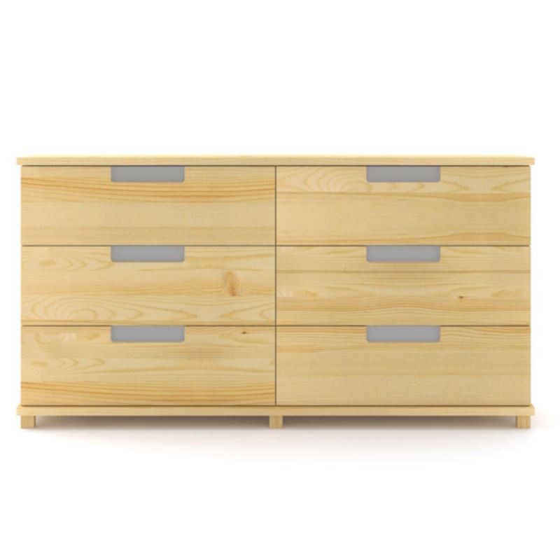 Nowoczesna drewniana komoda sosnowa z sześcioma pojemnymi szufladami i szklanymi uchwytami, wykonana z litego drewna sosnowego.