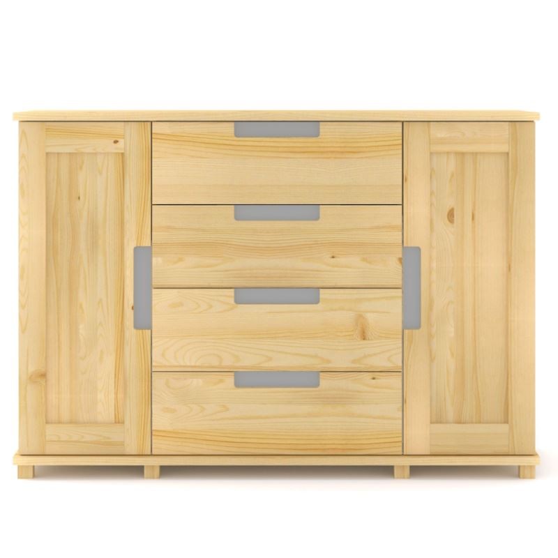 Nowoczesna duża drewniana szeroka komoda sosnowa z czterema szufladami i drzwiami po obu stronach, wykonana z litego drewna sosnowego.