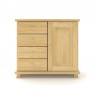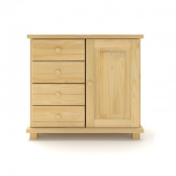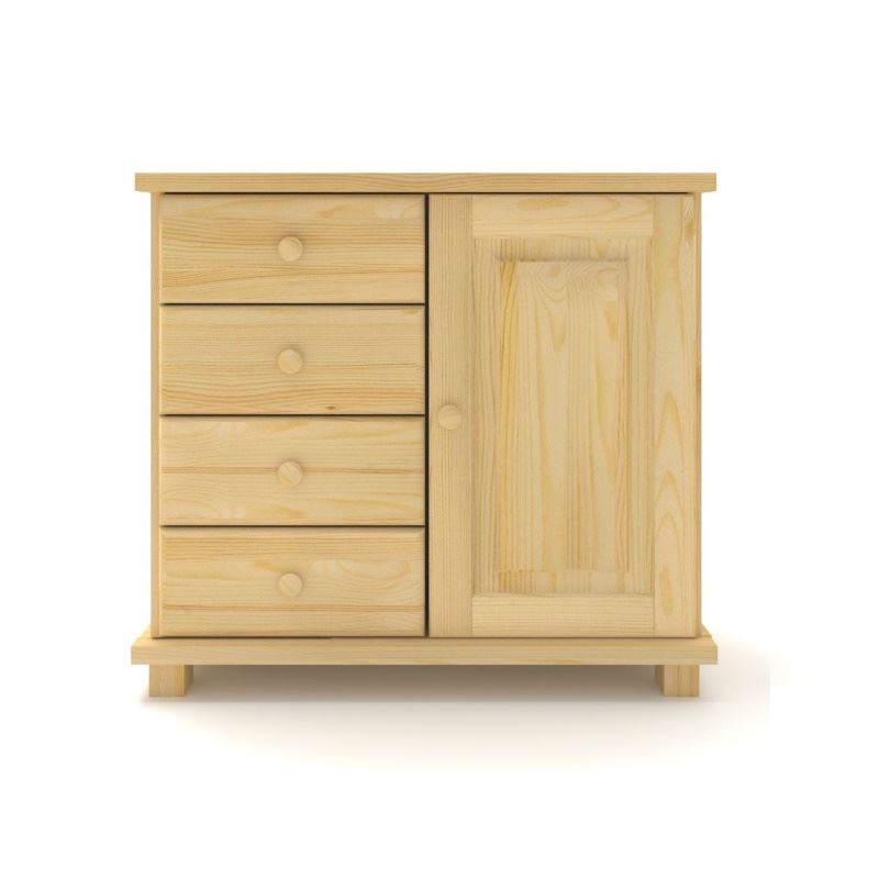 Drewniana komoda sosnowa z blatami w formie ostrego kantu, z czterema praktycznymi szufladami i drzwiami z półką wewnątrz, wykonana z litego drewna sosnowego.