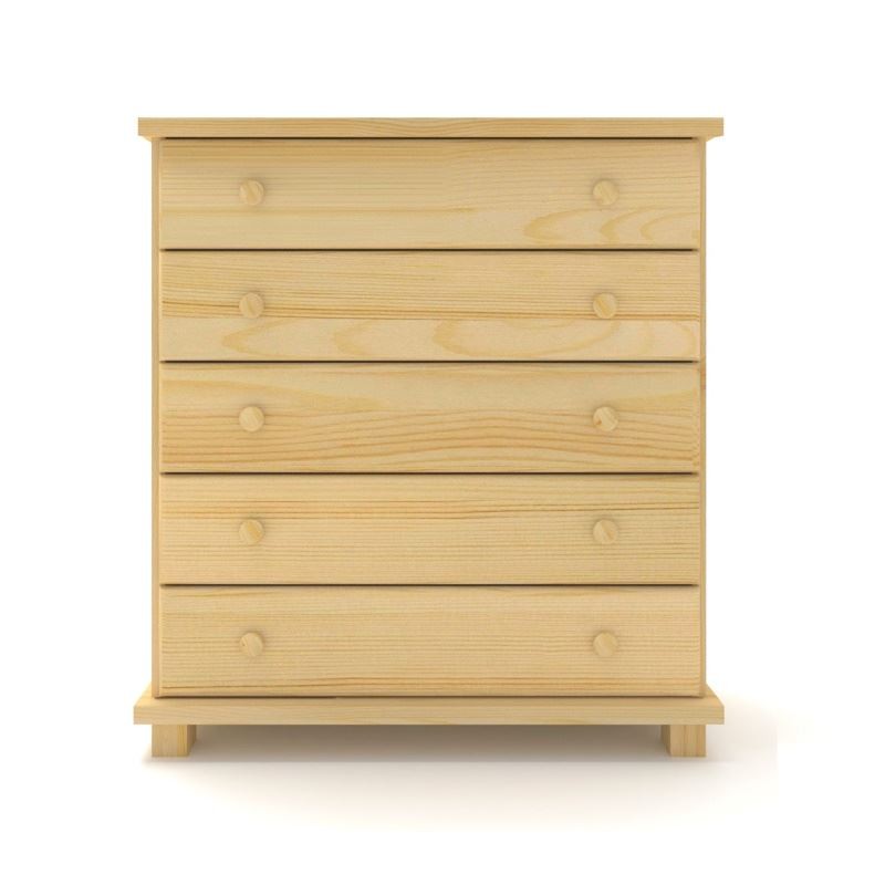 Drewniana komoda sosnowa z blatami w formie ostrego kantu, z pięcioma praktycznymi szufladami, wykonana z litego drewna sosnowego.