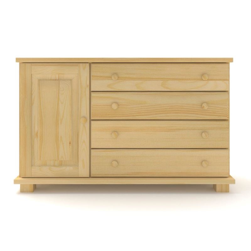 Drewniana komoda sosnowa z blatami w formie ostrego kantu, z czterema dużymi szufladami po prawej stronie i drzwiami z półką na środku, wykonana z litego drewna sosnowego.