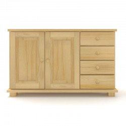 Drewniana komoda sosnowa z blatami w formie ostrego kantu, z czterema pojedynczymi szufladami po prawej stronie i podwójnymi drzwiami z dużą półką, wykonana z litego drewna sosnowego.