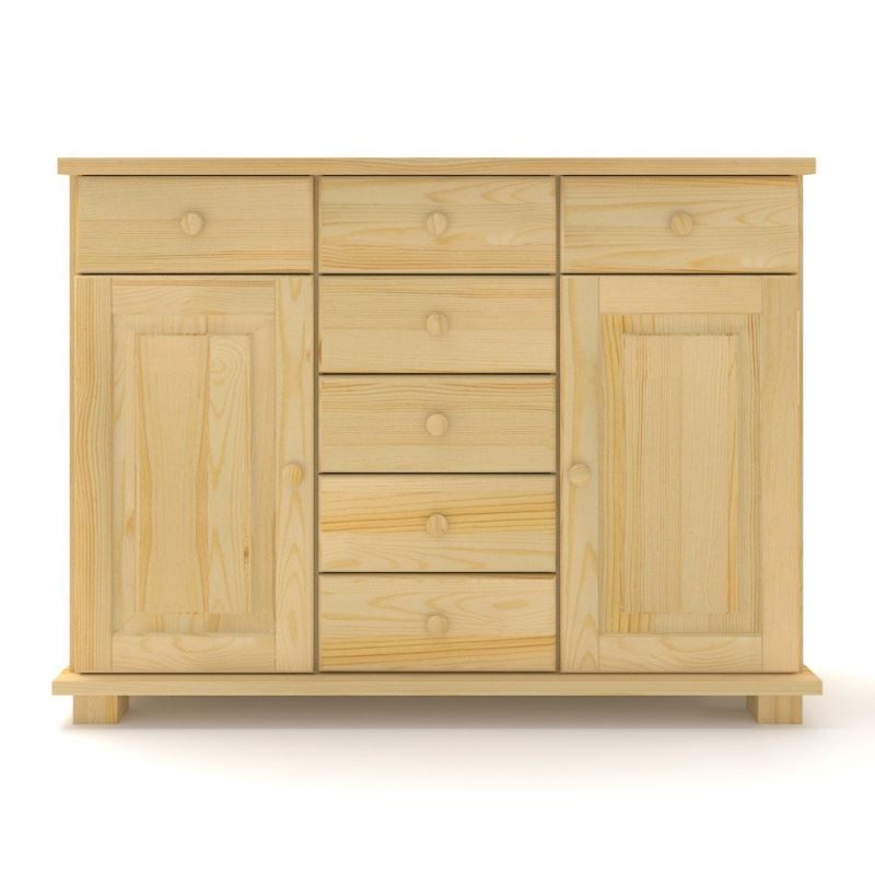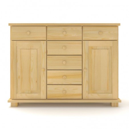 Drewniana komoda sosnowa z blatami w formie ostrego kantu, z pięcioma szufladami na środku oraz drzwiami z półką i jedną szufladą po bokach, wykonana z litego drewna sosnowego.