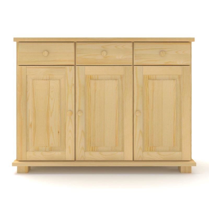 Drewniana wysoka komoda sosnowa z blatami w formie ostrego kantu, z trzema drzwiami z półką oraz szufladami pod blatem, wykonana z litego drewna sosnowego.