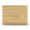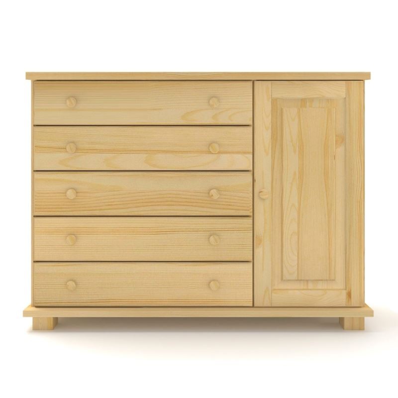 Drewniana komoda sosnowa z blatami w formie ostrego kantu, z pięcioma dużymi szufladami po lewej stronie i drzwiami z półką na środku, wykonana z litego drewna sosnowego.