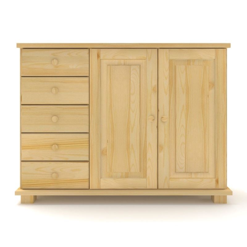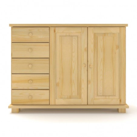 Drewniana komoda sosnowa z blatami w formie ostrego kantu, z pięcioma pojedynczymi szufladami po lewej stronie i podwójnymi drzwiami z dużą półką, wykonana z litego drewna sosnowego.