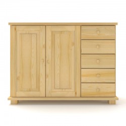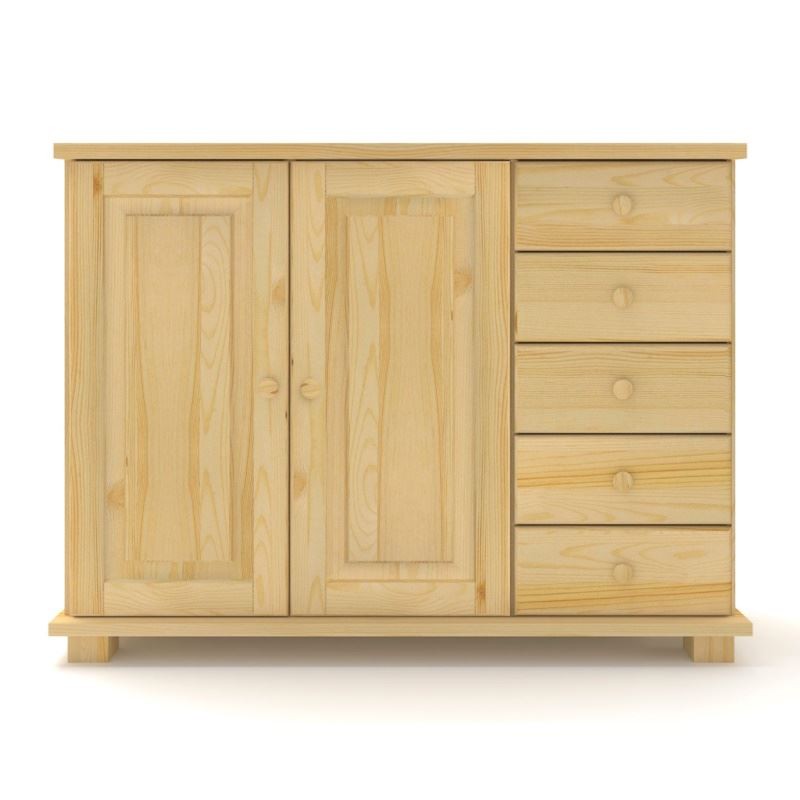Drewniana komoda sosnowa z blatami w formie ostrego kantu, z pięcioma pojedynczymi szufladami po prawej stronie i podwójnymi drzwiami z dużą półką, wykonana z litego drewna sosnowego.