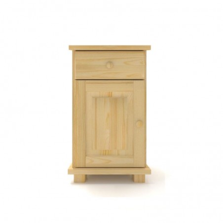 Nowoczesna wąska drewniana komoda z litego drewna sosnowego z jedną szufladę w górnej części i drzwiczkami.