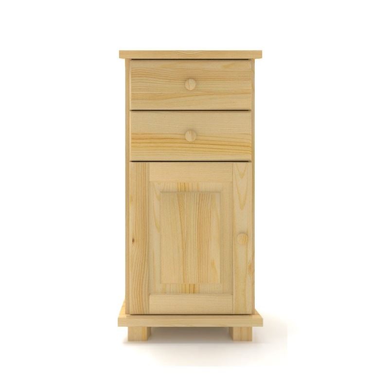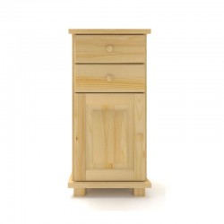 Nowoczesna, wąska drewniana komoda z litego drewna sosnowego. 2 pojedyncze szuflady + drzwiczki.