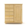 Klasyczna drewniana komoda sosnowa z pięcioma szufladami i drzwiami z półką, wykonana z litego drewna sosnowego.