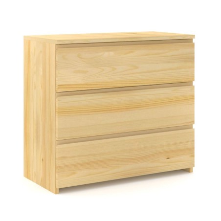 Nowoczesna drewniana komoda sosnowa z trzema pojemnymi bez uchwytowymi szufladami, wykonana z litego drewna sosnowego.