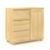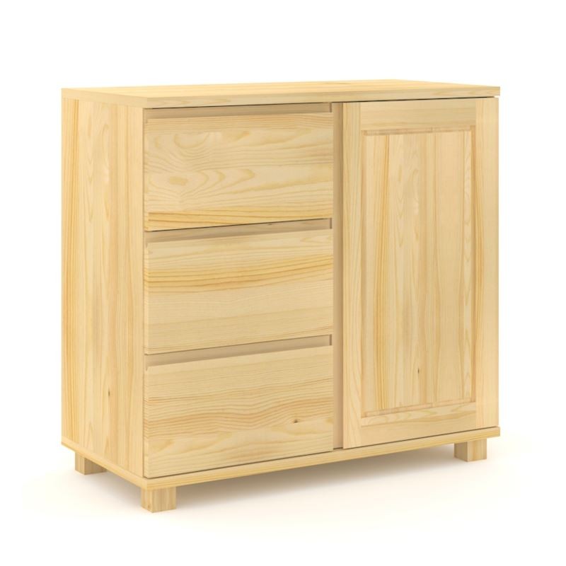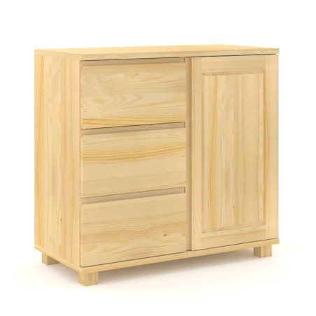 Nowoczesna drewniana komoda sosnowa z trzema pojemnymi bez uchwytowymi szufladami i pojedynczymi drzwiami z półką, wykonana z litego drewna sosnowego.