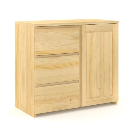 Nowoczesna drewniana komoda sosnowa na cokole z trzema pojemnymi bez uchwytowymi szufladami i pojedynczymi drzwiami z półką, wykonana z litego drewna sosnowego.