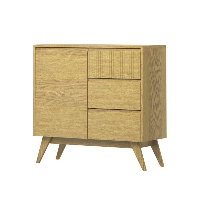 Nowoczesna komoda dębowa na wysokich nóżkach, z trzema pojemnymi szufladami i drzwiczkami z półką, wykonana z drewna dębowego.