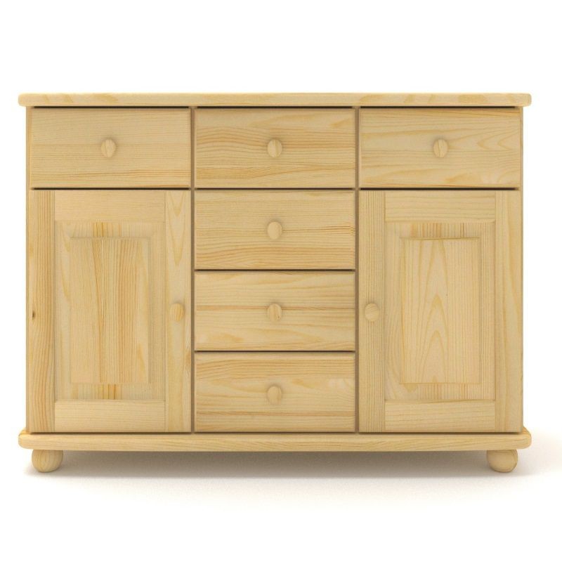 Praktyczna komoda pojemna z litego drewna sosnowego. Sześć pojedynczych, bardzo pojemnych szuflad o zwiększonych wymiarach + drzwiczki po bokach z półkami.