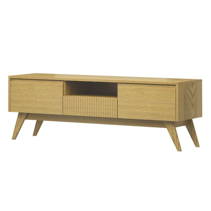 Nowoczesna komoda dębowa RTV na wysokich nóżkach, z szufladą, drzwiczkami i jedną wnęką na sprzęt elektroniczny, wykonana z drewna dębowego.