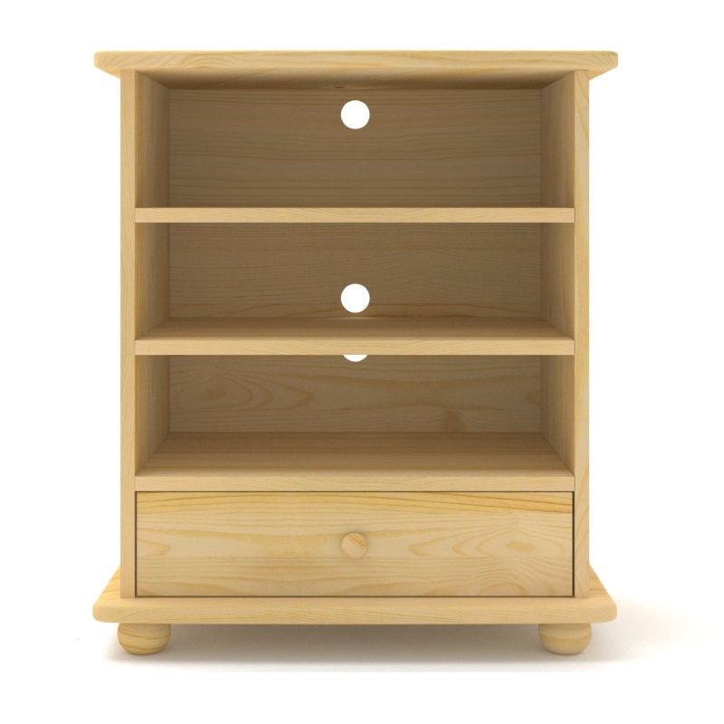Wąska i wysoka drewniana komoda - szafka RTV wykonana z litego drewna sosnowego z jedną szufladą i trzema wnękami pod sprzęt elektroniczny.