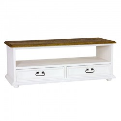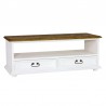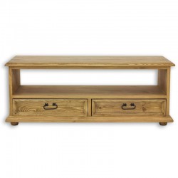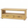 Rustykalna klasyczna szeroka komoda sosnowa RTVW 02 z dwiema szufladami oraz otwartą półką, wykonana z litego drewna sosnowego.
