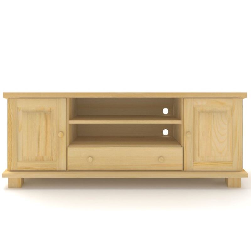 Szeroka drewniana komoda - szafka RTV z blatami w ostry kant, wykonana z litego drewna sosnowego. Wyposażona w dwie szafki, jedną dużą szufladę oraz wnęki na sprzęt.