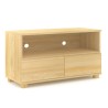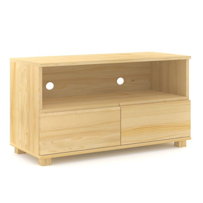 Nowoczesna drewniana komoda sosnowa RTV z dwiema pojemnymi bez uchwytowymi szufladami i wolną przestrzenią na sprzęt elektroniczny, wykonana z litego drewna sosnowego.