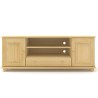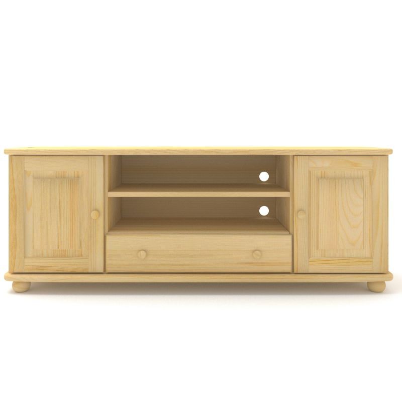 Szeroka drewniana komoda - szafka RTV, wykonana z litego drewna sosnowego. Wyposażona w dwie szafki, jedną dużą szufladę oraz wnęki na sprzęt.