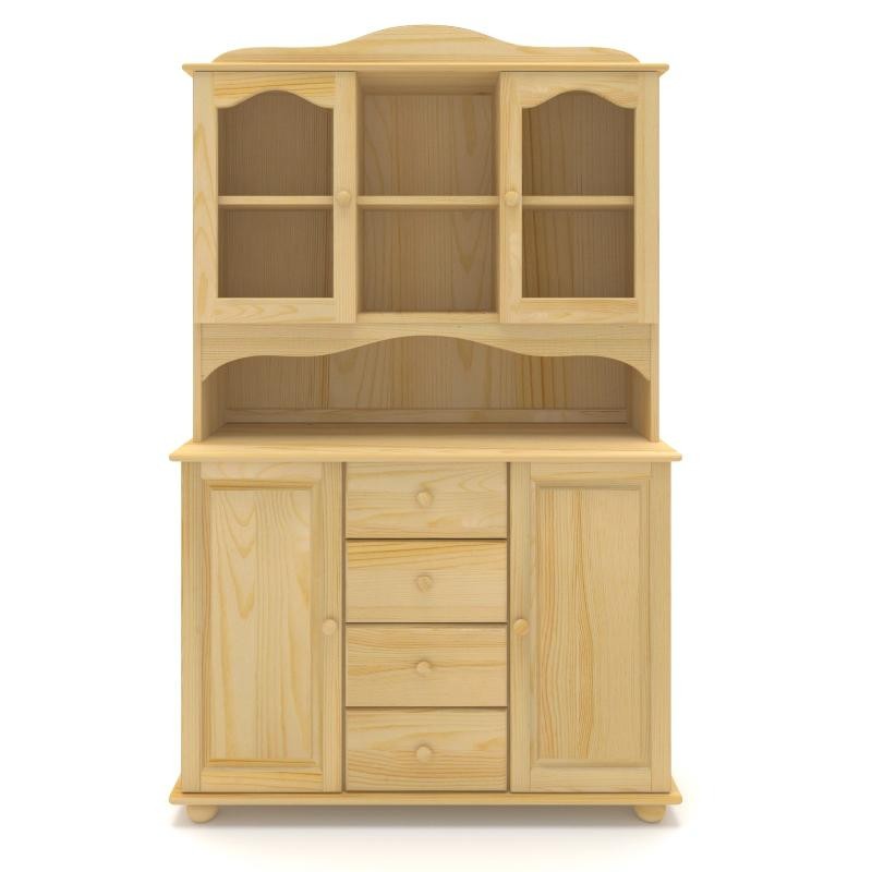 Klasyczny duży drewniany kredens sosnowy wyposażony w parę drzwi z półką i szufladami oraz przeszklone drzwi z półką w górnej części, wykonany z litego drewna sosnowego.