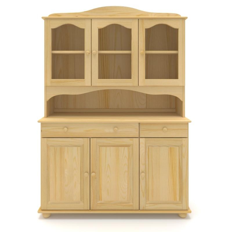 Klasyczny, masywny duży drewniany kredens sosnowy wyposażony w drzwi z półką i szuflady oraz przeszklone drzwi z półką w górnej części, wykonany z litego drewna sosnowego.