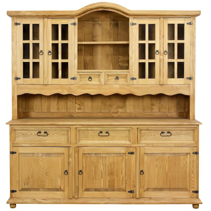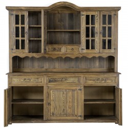 Duży, szeroki drewniany woskowany kredens z szufladami + podwójne drzwiczki przeszklone w górnej części z kratownicą i półkami, wykonany z litego drewna sosnowego.