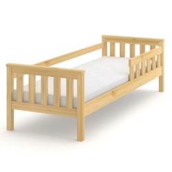 Klasyczne drewniane łóżko dziecięce z pionowymi szczebelkami i barierką zabezpieczającą, wykonane z litego drewna sosnowego.