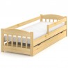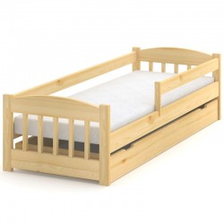 Klasyczne drewniane łóżko dziecięce z barierką i szczebelkami, wykonane z litego drewna sosnowego pod rozmiar materaca 70x140 cm.