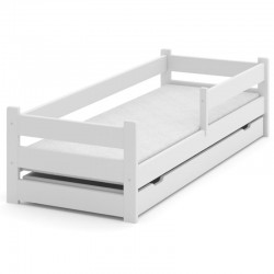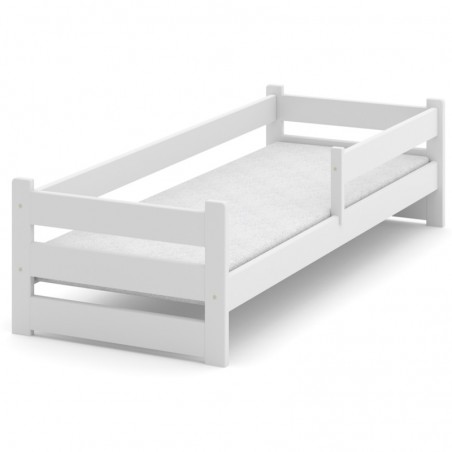 Klasyczne białe drewniane łóżko dziecięce Lili Plus z barierką zabezpieczającą pod materac 70x140 cm, wykonane z litego drewna sosnowego.