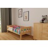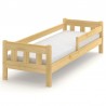 Klasyczne drewniane łóżko dziecięce z trzema pionowymi szczebelkami oraz barierką zabezpieczającą, wykonane z litego drewna sosnowego.