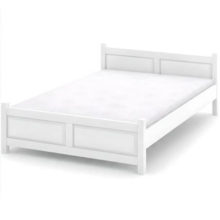 Klasyczne drewniane łóżko w kolorze białym z prostymi podwyższonymi oparciami, wykonane z litego drewna sosnowego.