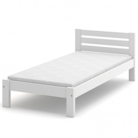 Klasyczne drewniane łóżko o solidnej ramie i stabilnych nogach wykonane z litego drewna sosnowego w kolorze białym.