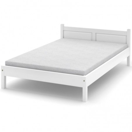 Klasyczne drewniane białe łóżko z prostym zagłówkiem, wykonane z litego drewna sosnowego.